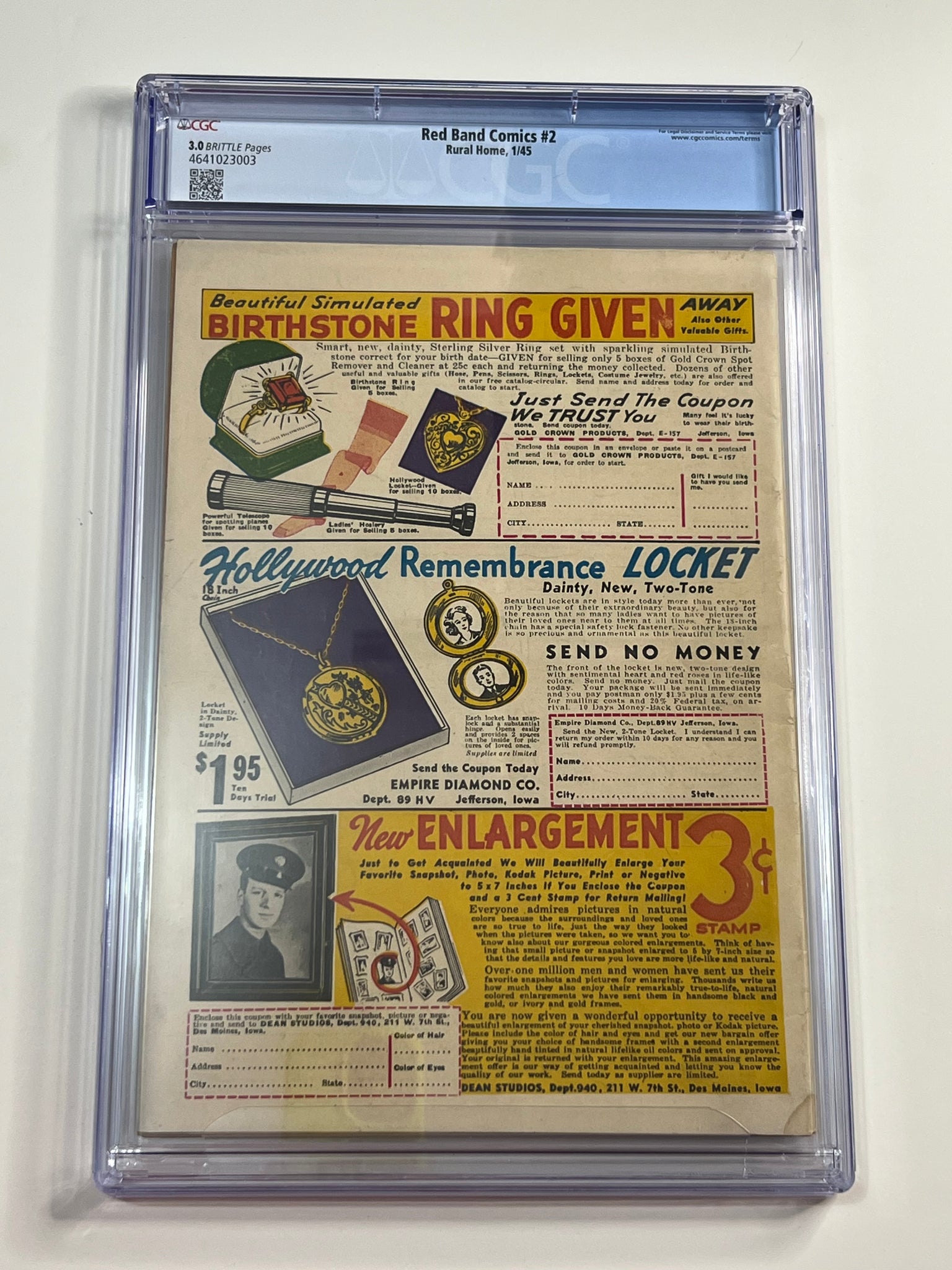 Red Band Comics #2 CGC 3.0 Rural Home 1945!!
